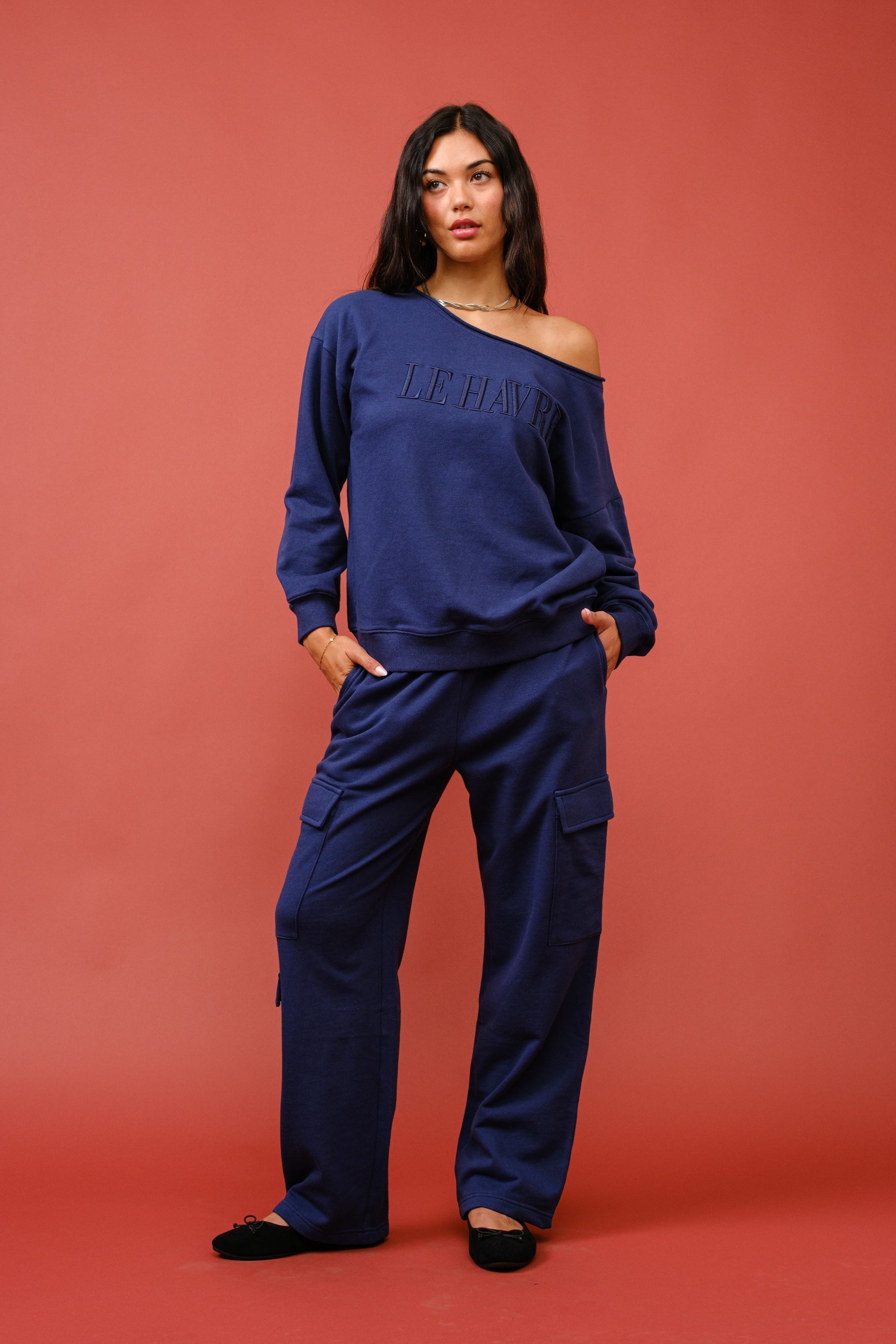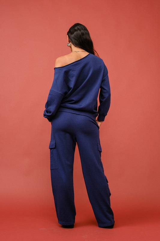 WIDE LEG CARGO SWEATPANTS WITH SIDE POCKETS AND OFF SHOULDER SWEATSHIRT